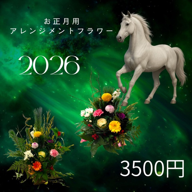 新しい一年の始まりを華やかに彩る、特別なお正月アレンジをご用意しました。 縁起の良い「松・竹・梅」を中心に、厳選した新鮮な生花を丁寧にカゴに生け込んだ、上品で華やかな一品です。 松は長寿と繁栄を、竹はまっすぐに伸びる力強さを、梅は寒さに耐えて咲く生命力を象徴し、一年の幸せと健康を願う縁起物として古くから親しまれてきました。 ご自宅の玄関や床の間を彩るのはもちろん、年始のご挨拶や贈り物としても大変喜ばれる逸品です。 お正月を迎える特別なひとときを、心を込めた華やかな花飾りとともに。 ◆商品内容:松竹梅入り生花アレンジ(カゴ入り) ◆価格:3,500円(税込) ◆送料:地域別にてご案内いたします 数量限定のため、ご予約はお早めにどうぞ。 新しい年を華やかに迎えるお手伝いをいたします。
