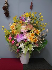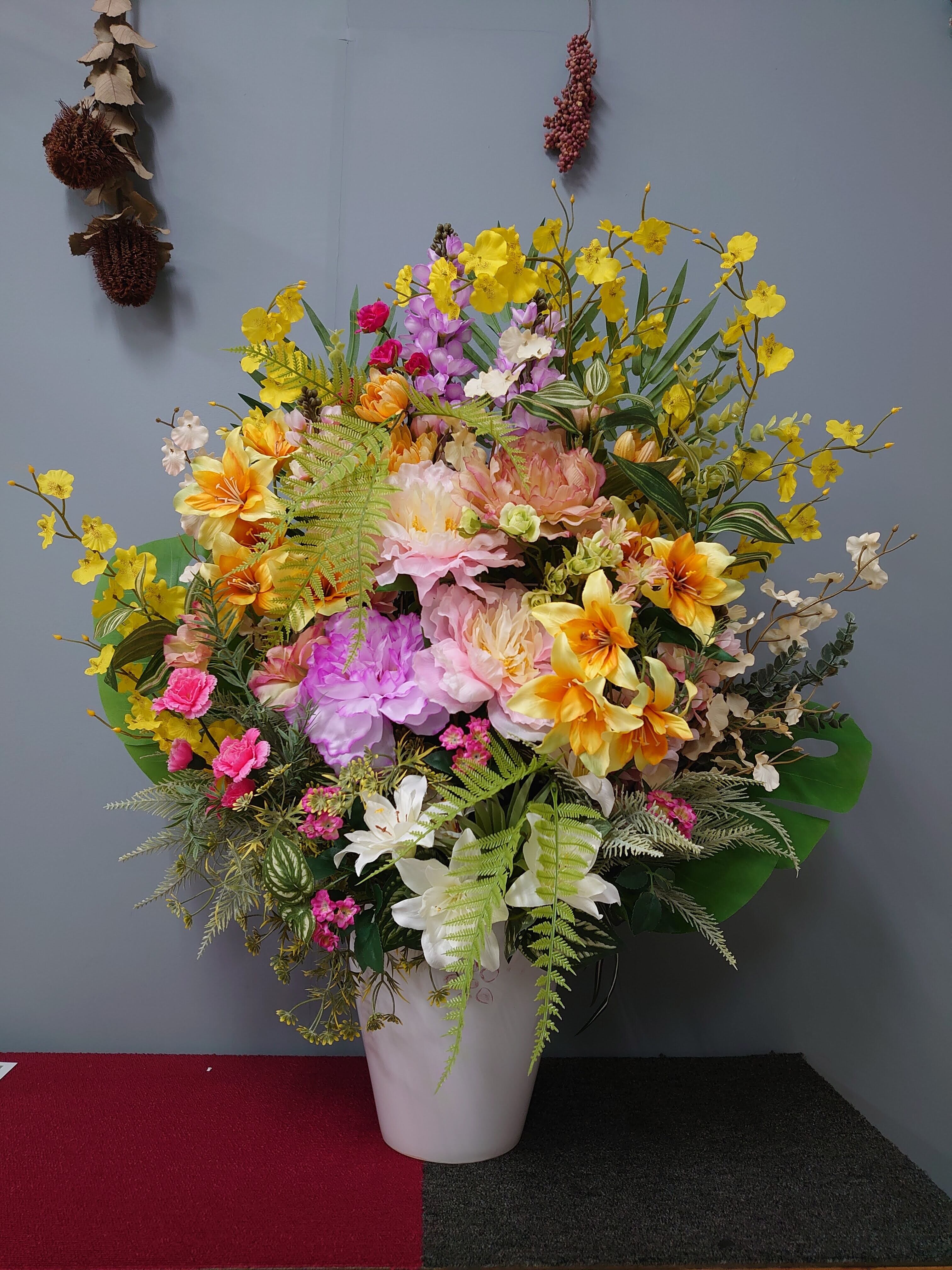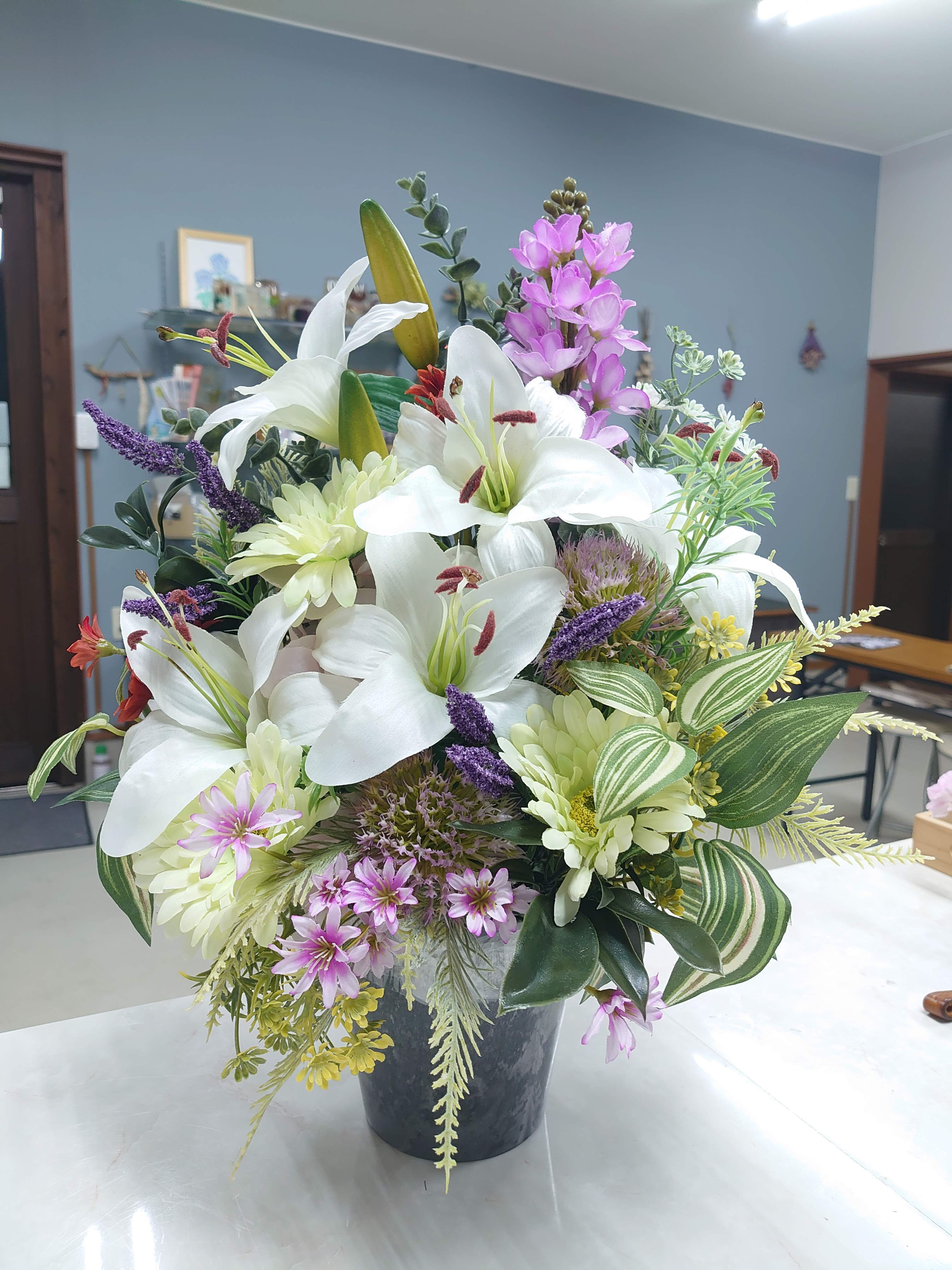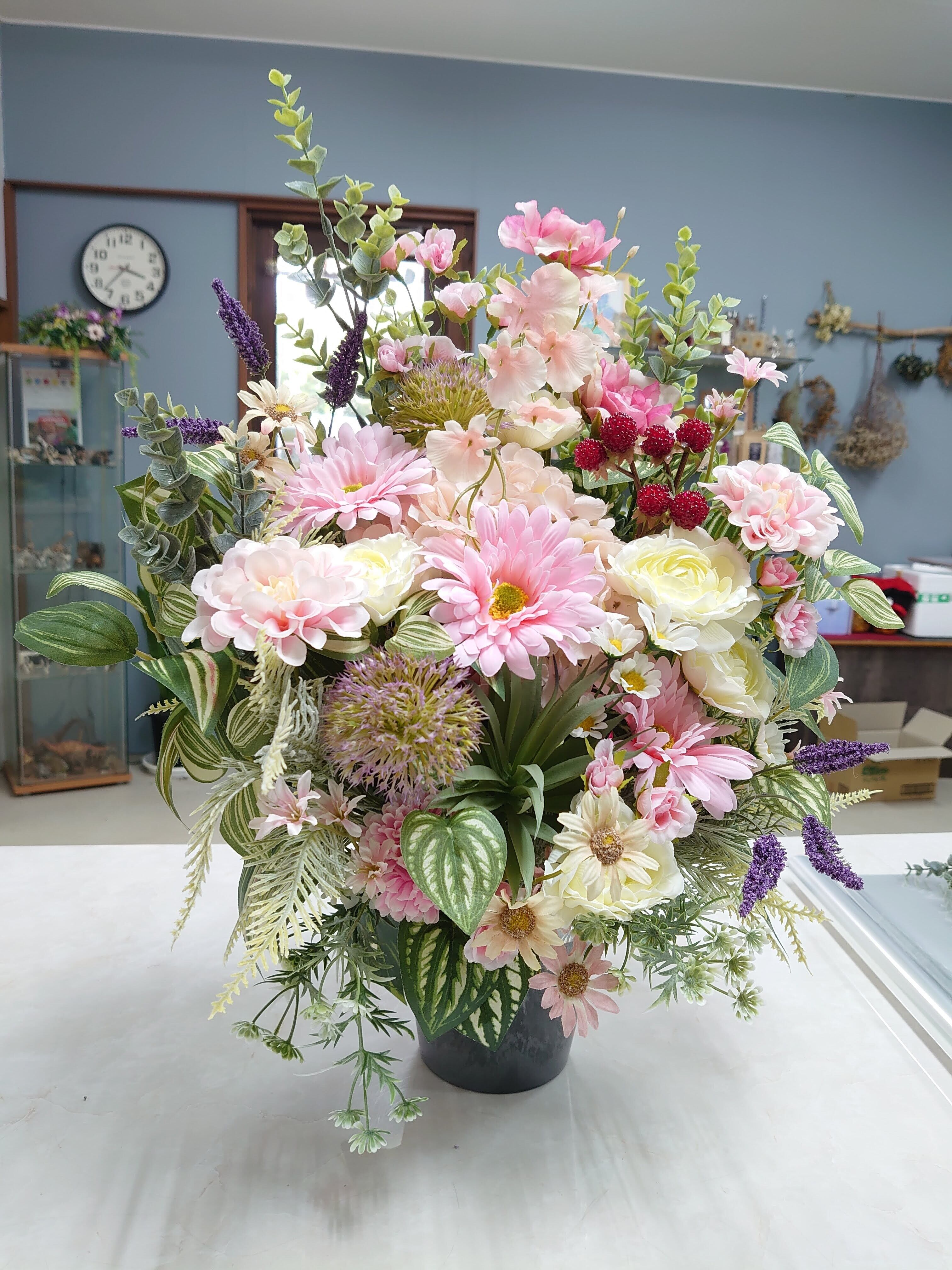 当店の造花アレンジメントは、そのリアルな質感と華やかさで、生花と見間違えるほどの仕上がりが自慢です。経験豊富なスタッフが、生花店ならではのセンスと技術で、お客様のご希望に合わせた唯一無二のアレンジメントをお届けします。