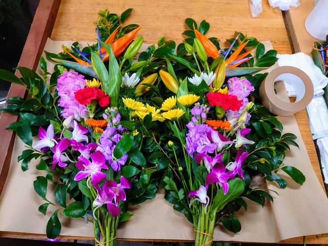 5500円の花束をご用意いたしました。このアレンジフラワーは、季節の美しい花々をふんだんに使用し、色鮮やかでフレッシュな香りをお楽しみいただけるボリュームたっぷりの花束です。お祝い事や特別な日にぴったりの花束で、贈る方も受け取る方も笑顔になること間違いありません。皆様の特別な日を彩る花束を心を込めてお届けします。ご気軽に、ご希望、ご要望などご相談ください。 ラッピングしてお届けいたします。 県外配送料金には箱代660+(クール代金)は送料に含まれています。 尚、クール便には120センチサイズまでのものしかお取り扱いができません。 規定内の箱に収まるように、お花の種類を調整させて頂いています。
